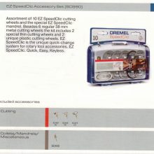 The Dremel SC690 EZ SpeedClic Cutting Accessories Set is an assortment of 10 EZ SpeedClic cutting wheels and the special EZ SpeedClic mandrel. Besides 6 regular 38 mm metal cutting wheels the kit includes 2 special thin cutting wheels and 2 unique plastic cutting wheels. EZ SpeedClic is the unique quick-change system for rotary tool accessories. EZ SpeedClic. Quick, Easy, Keyless.